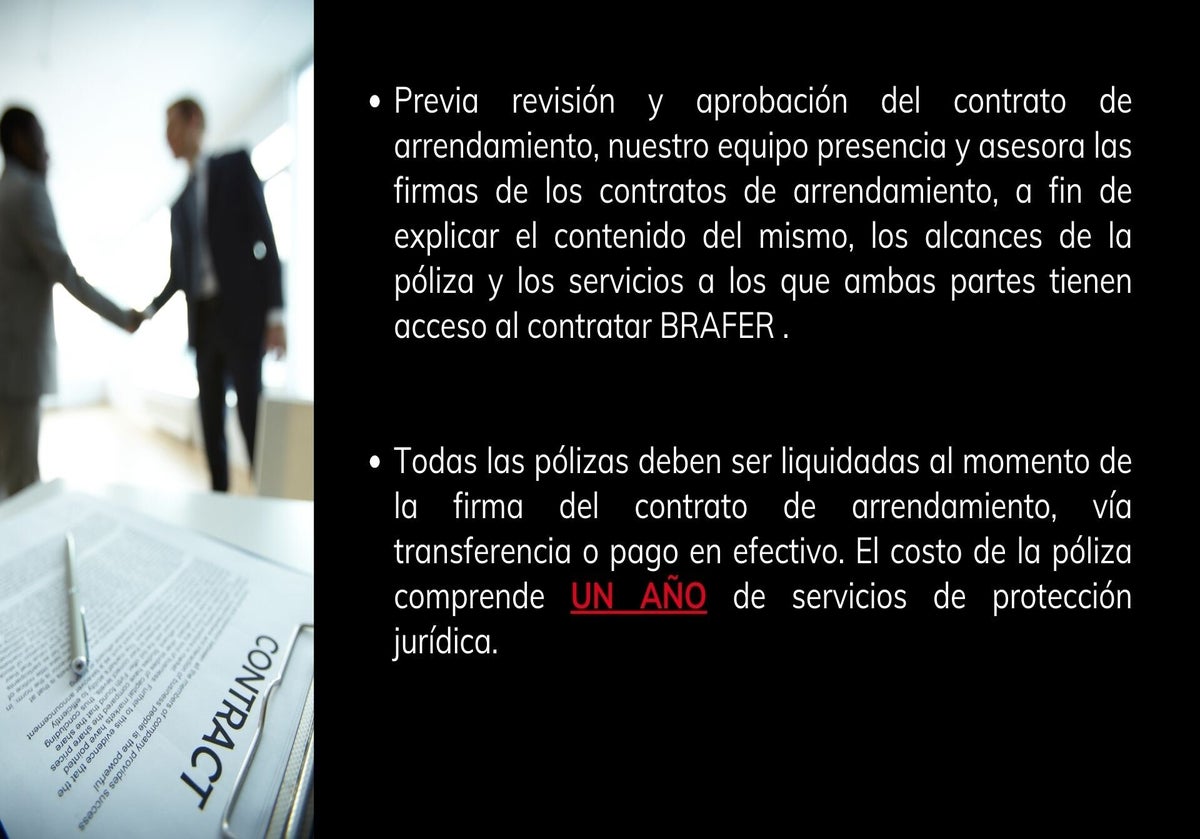 En BRAFER Póliza Jurídica Inmobiliaria, nos especializamos en brindar respaldo legal para prevenir inconvenientes durante y después del periodo de arrendamiento. Nuestros servicios están diseñados para proteger tus inmuebles y garantizar tu tranquilidad.